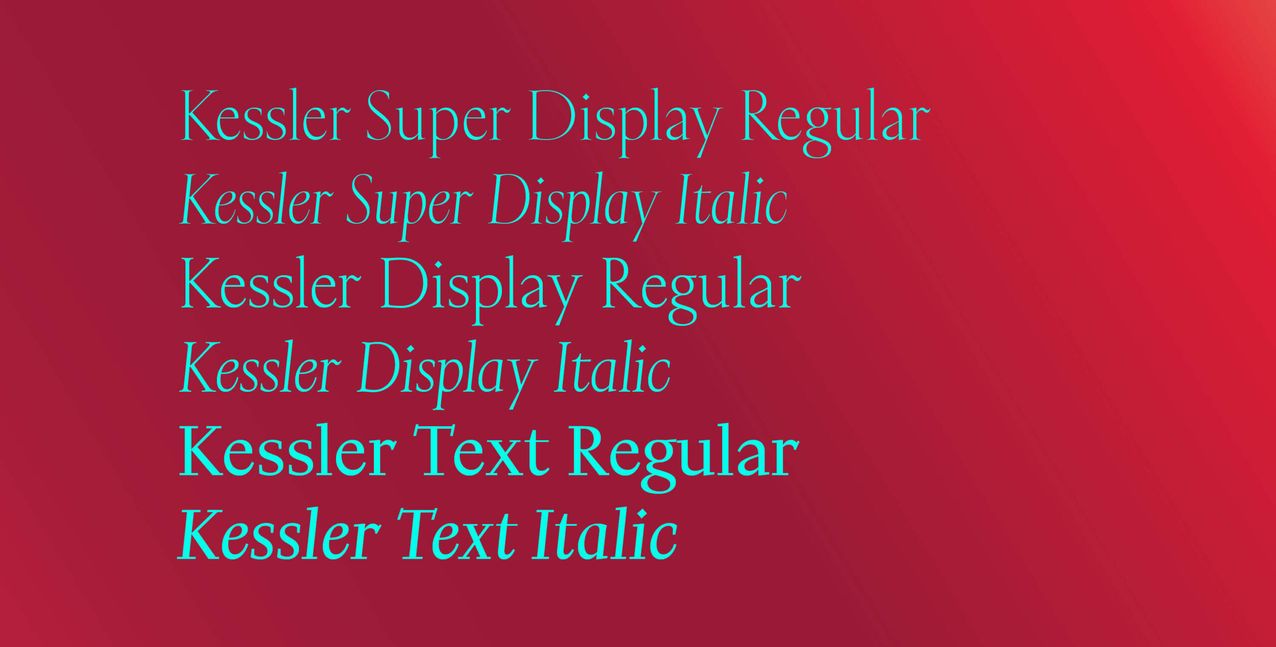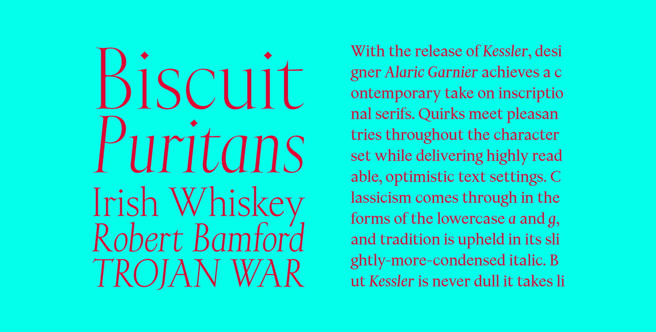 Mit der Veröffentlichung von «Kessler» gelingt dem Designer Alaric Garnier eine zeitgemässe Interpretation der Serifenschrift. «Kessler» ist nie langweilig; sie nimmt sich viele Freiheiten heraus und funkelt über die Seite.